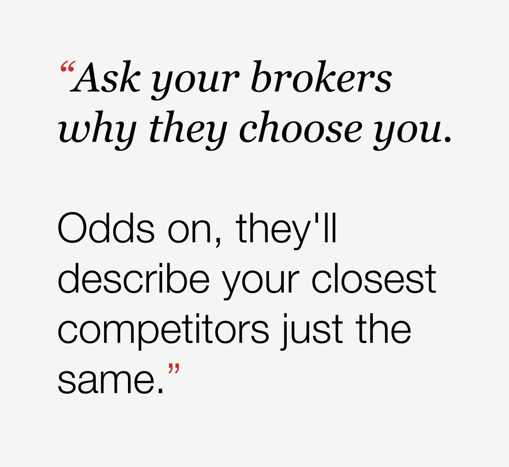As a result, every campaign starts from a weak foundation. Every BDM conversation sounds like the last one. And when brokers can’t articulate why they choose you, they default to familiarity or price.